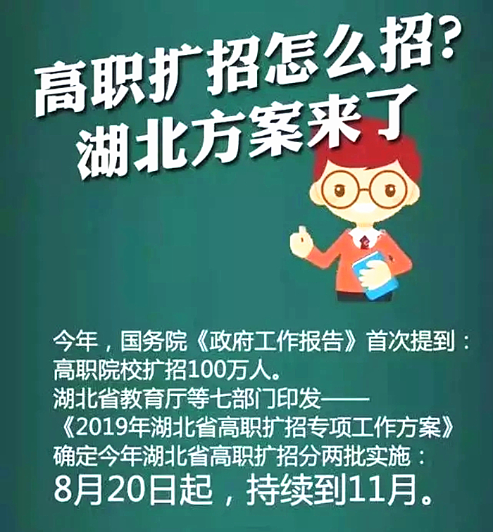 在今年全國“兩會”上,李總理在政府工作報告中,圍繞穩定和擴大就業,明確提出“全國高職院校擴招100萬人”。這是黨中央、國務院作出的重大決策,是落實《國家職業教育改革實施方案》的重要舉措,是職業教育改革發展的重大機遇,將對我國教育發展產生重大影響。按照國家統一部署,8月中旬,經省人民政府同意,省教育廳聯合省發改委、省公安廳、省財政廳、省人社廳、省農業農村廳、省退役軍人事務廳七部門聯合印發了《2019年湖北省高職擴招專項工作方案》。