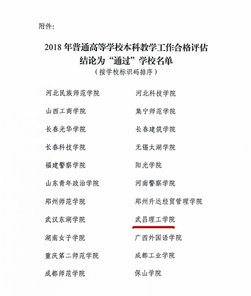 近日,根據教育部普通高等學校本科教學工作評估專家委員會的審議結果,武昌理工學院本科教學工作合格評估結果為“通過”。這一評估結果,意味著學校的本科教學工作得到了教育部的認可,是學校發展史上具有里程碑意義的重大事件,必將為學校各項事業發展產生積極而深遠的影響。