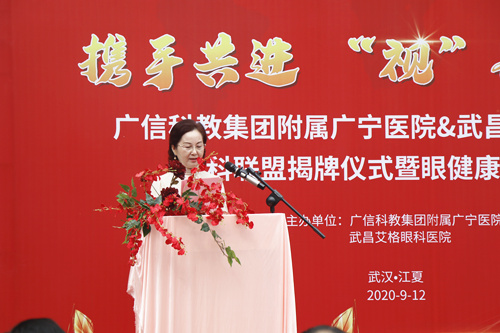 在現場數百位觀眾的見證下,與會領導嘉賓為眼科?坡撁私遗啤4舜窝劭茖?坡撁耸峭晟漆t療服務體系的重要舉措,對雙方推進醫聯體內、醫療機構間雙向轉診,對提升武漢廣寧醫院醫療技術水平、綜合服務能力,對激發廣信科教集團大健康產業發展模式的探索都具有深遠意義。