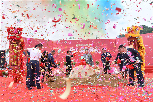 隨后,廣信科教集團董事局副主席、副總裁呂驊燕宣布項目開工,呂驊燕、楊元新、吳錫琛、葉佳斌上臺齊為雄獅點睛。此時雄獅起舞,掌聲雷鳴,禮炮作響,領導、嘉賓手持金鍬培土奠基,正式宣告澳門山莊二期項目啟動。江夏經濟開發區黨工委、廟山管委會領導,武漢新聞媒體、各合作單位及社會各界朋友也共同見證了這一歷史性時刻。