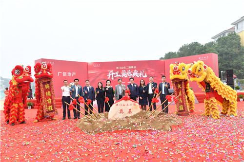 樁深新業起,基實宏圖展。2020年9月26日,由廣信地產和順聯地產投資建設的澳門山莊二期項目開工奠基典禮隆重舉行。廣信科教集團董事局副主席、副總裁呂驊燕,江夏經濟開發區管委會主任劉仕斌,項目總承包單位民族建設集團有限公司副總裁葉杰出席奠基典禮并發表重要講話。
