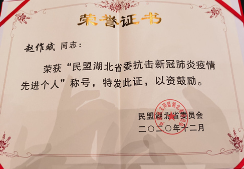 2020年12月,廣信科教集團董事局主席、總裁,武昌理工學院校長,中國民主同盟湖北省委副主委趙作斌被授予“民盟湖北省委抗擊新冠肺炎疫情先進個人”稱號。