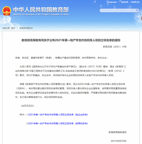 為深入貫徹《國務院辦公廳關于深化產教融合的若干意見》(國辦發〔2017〕95號)精神,落實《教育部 工業和信息化部 中國工程院關于加快建設發展新工科 實施卓越工程師教育培養計劃2.0的意見》(教高〔2018〕3號)要求,深化產教融合、校企合作,教育部高等教育司組織有關企業和高校持續深入實施產學合作協同育人項目。
