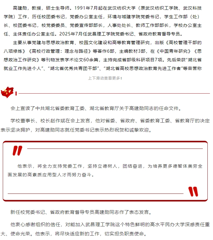 頭條|高建勛同志就任武昌理工學院黨委書記